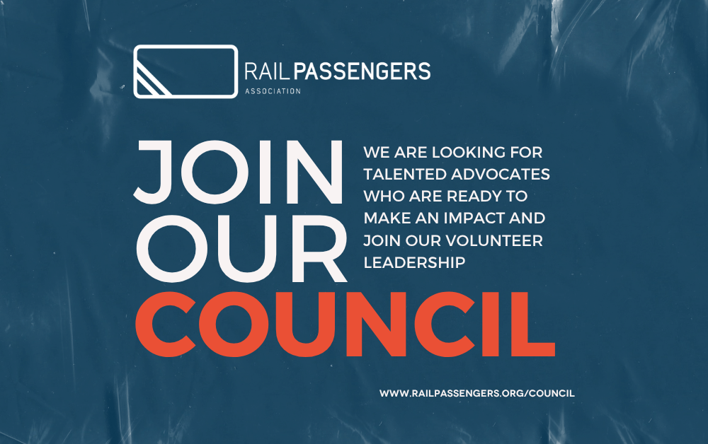 Every other year, we give interested Rail Passengers members the opportunity to take their support for more and better passenger trains to the next level by taking part in our national volunteer advisory body, the Council of Representatives. We are now accepting candidates wishing to be elected to the Council as State Representatives for the two-year term ending February 29, 2028.