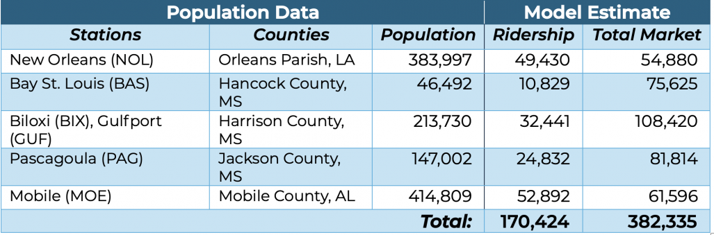 Our ridership estimates at the two terminal stations, New Orleans and Mobile, represent between 85 and 90 percent of the predicted addressable market. At intermediate stations, however, estimated ridership is less than 30 percent of that potential market -- and as low as 14 percent in Bay St. Louis.