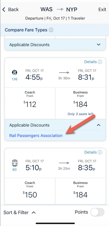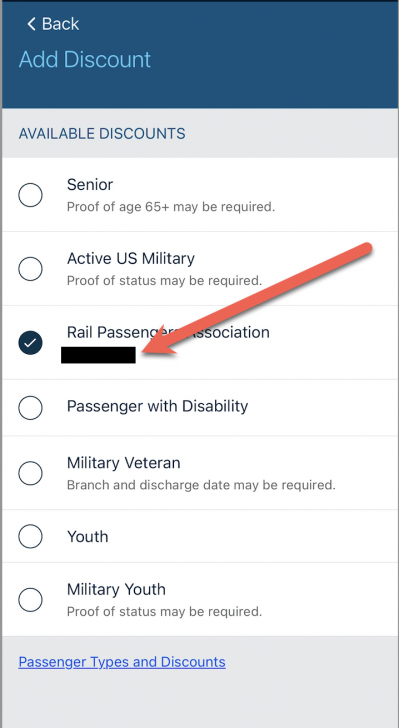 On the next screen, there will be a list of available discounts to add. Click on Rail Passengers Association: