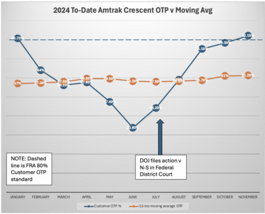 It's also probably worthwhile here to remind readers of some pretty compelling evidence that the Crescent’s delays on Norfolk Southern territory were largely avoidable: in the five months since the Justice Dept. filed its action, Customer on-time performance for the Crescent rebounded from a low of 33 percent to 82 percent in November (see graphic below). That’s good enough to meet the 80 percent standard set out in regulations during the last month of the first Trump Administration in 2020.