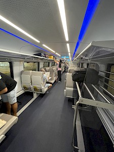 The train ride was quite a smooth ride and Brightline’s newer Siemens equipment is sleek, modern, and spotless. The seats are quite comfortable, though one thing I missed from Amtrak seating is the ability for the seat back to recline -instead, the lower part of the seat can move forward towards the seat in front of you to allow one to sit back a bit. The premium class seats are a bit wider, so they are arranged in 2x1 configuration, while in the basic Smart class they are 2x2. The trains are operated “push-pull” (meaning they are not turned around at the end points) so there are seats facing both directions and the seats in the middle of the car at the transition points have tables. The seats come with all the amenities you would expect – tray tables – overhead reading light, and baggage storage, as well as power outlets and USB charging ports for your mobile devices on both sides. There are also window shades that can be pulled down. The Wi-Fi seemed a lot speedier and more reliable than the service I had on any other previous train ride, and the internet service for the Wi-Fi is by SpaceX’s much talked about Starlink satellite service. The restrooms are fully accessible, clean, and modern with touchless controls and automatic doors. The trains move fast with 125 MPH speeds on the newly constructed dedicated alignment for Brightline between the Florida East Coastline and Orlando airport, and they max out at 90 MPH on the shared Florida East Coast corridor – they are testing to increase this to 110 MPH. The on-board crews were all very friendly and provided very timely announcements about any unexpected delays, including slowdowns for train meets. We took a lengthier delay on the way back north for a draw bridge that would not close, and the crew provided timely updates on the situation while we were stopped.