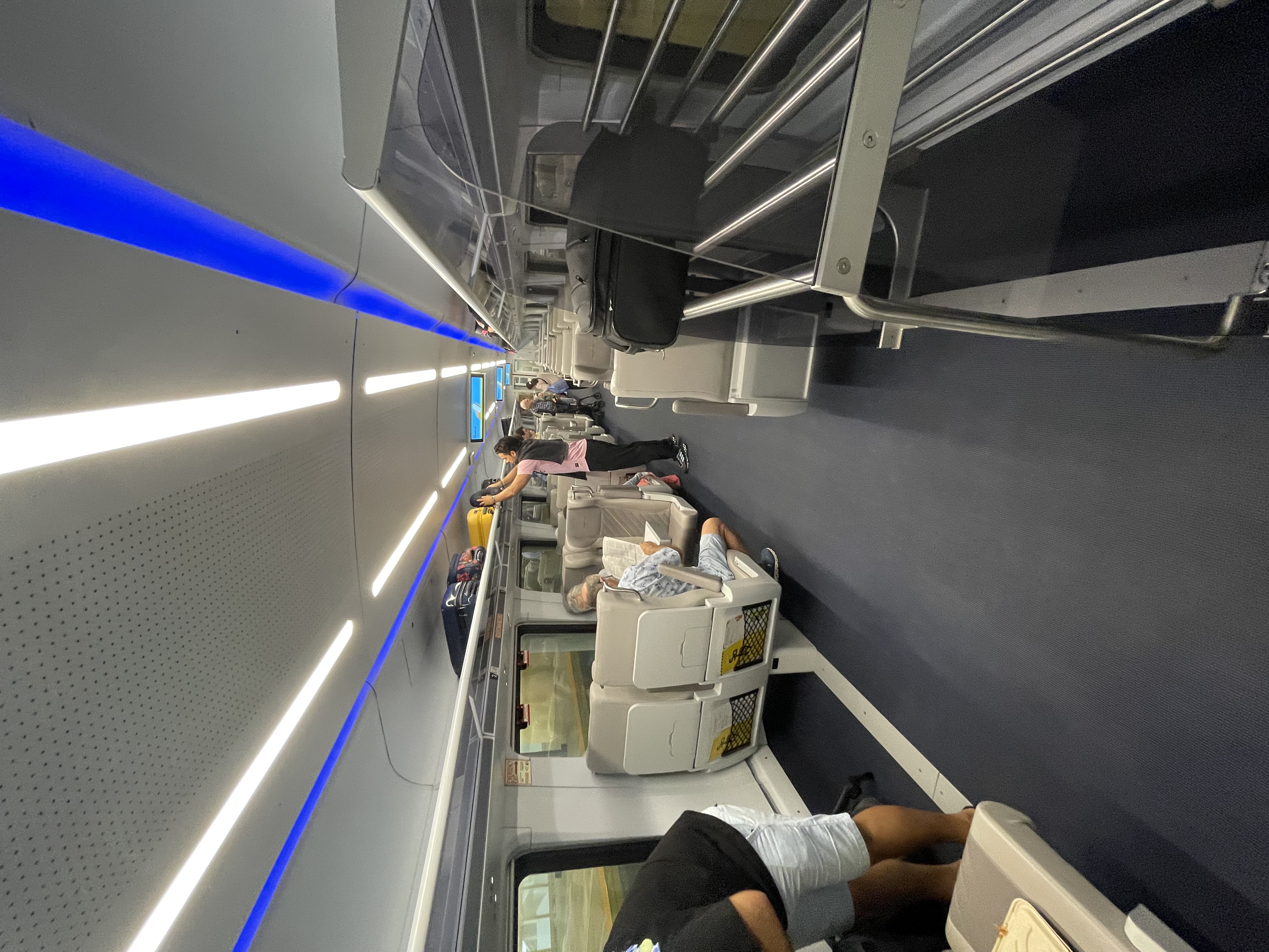 On Thursday, October 12, 2023, I took a round trip ride on Brightline from the new Orlando station to MiamiCentral in Downtown Miami. Brightline service began on the new West Palm Beach to Orlando segment in September. The new Orlando station is at Orlando International Airport next to their new C terminal. This was my first ever ride on Brightline and the station is sleek and modern and features a lot of high-tech gadgets including ticketed gated entry into the passenger waiting areas and lots of uses of technology I had never seen in a train station before. The station is easily accessible from the nearby toll roads serving the airport, and terminal C has its own rental car area and a tram connecting to the older part of the airport. Parking for Brightline is available in terminal C garage, with offsite shuttle parking as a backup when the garage fills up. Dedicated Brightline surface parking adjacent to the ground level Brightline drop off area is currently under construction but is not yet available, so for right now Brightline passengers must use either the garage or nearby economy lot/shuttle. When I got back to Orlando from the return trip I noticed that the parking garage was almost completely full, so I would definitely urge anyone who isn’t leaving on an early morning departure and needs to park to give themselves extra time in case they need to use the economy lot and shuttle bus at least until the new dedicated Brightline parking becomes available.